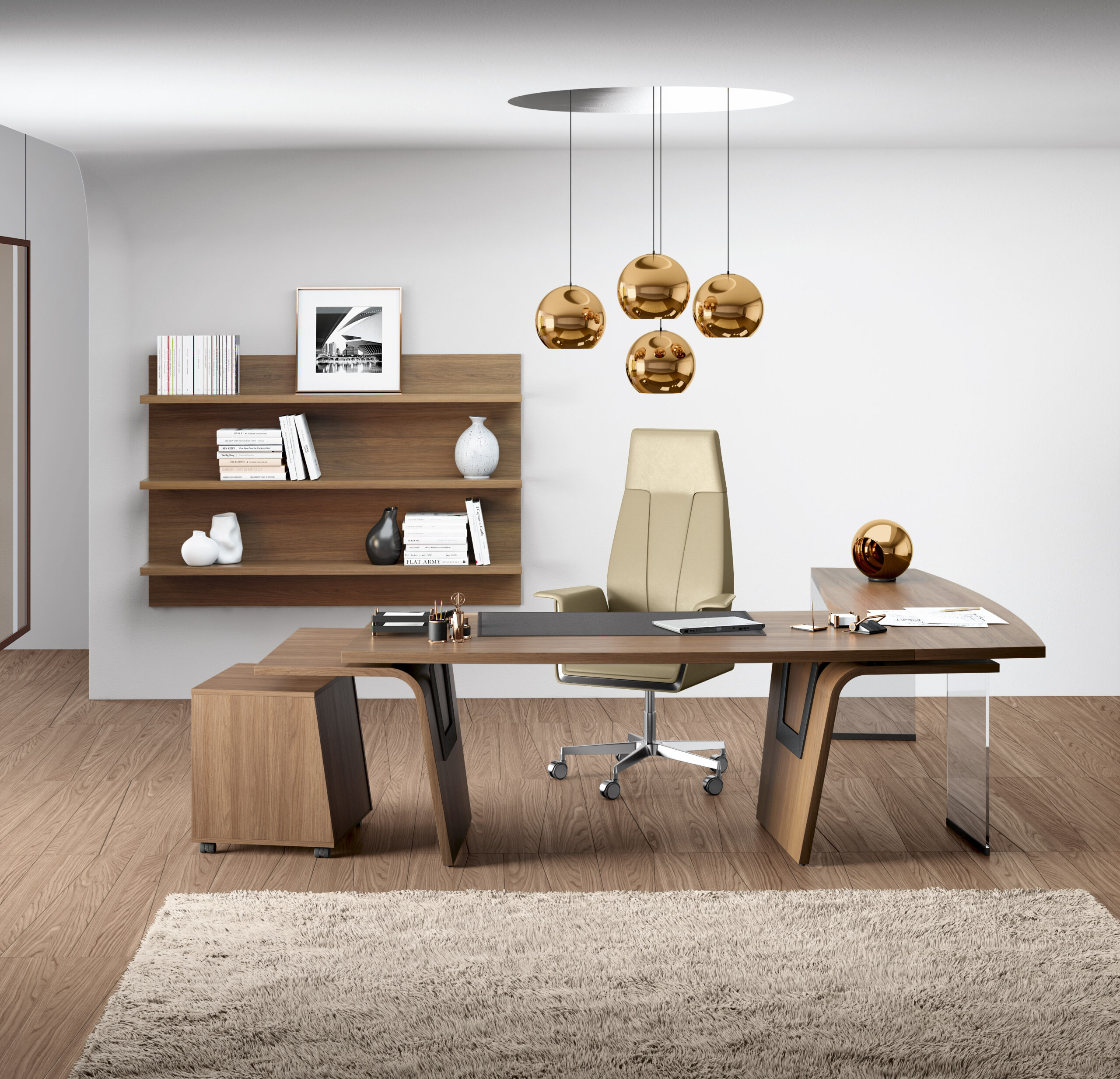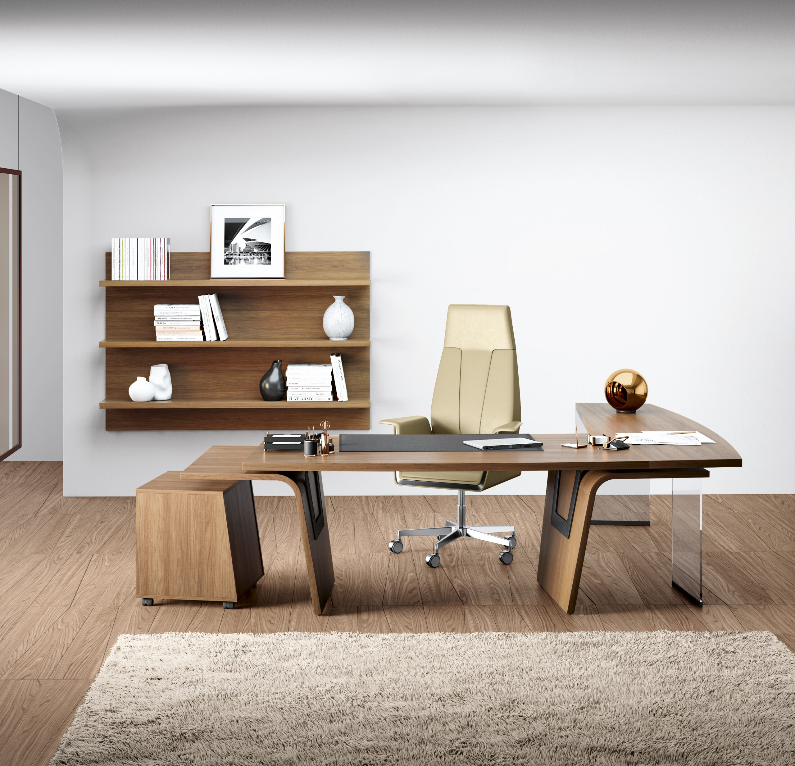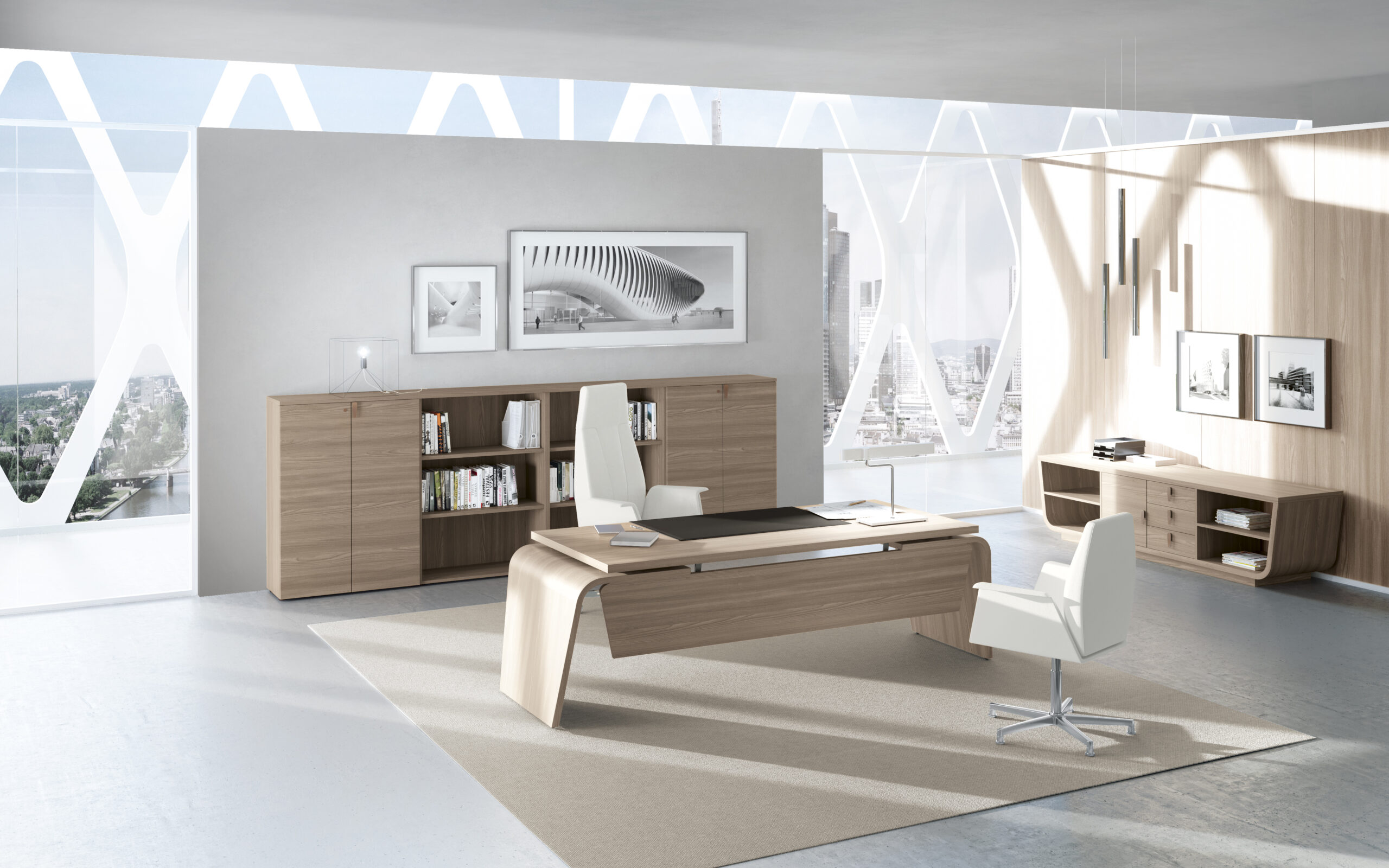 The structure is conceived in order to arrange the office with multiple solutions: desks, extensions, service element, pedestals, coffee tables, meeting tables and cabinets.