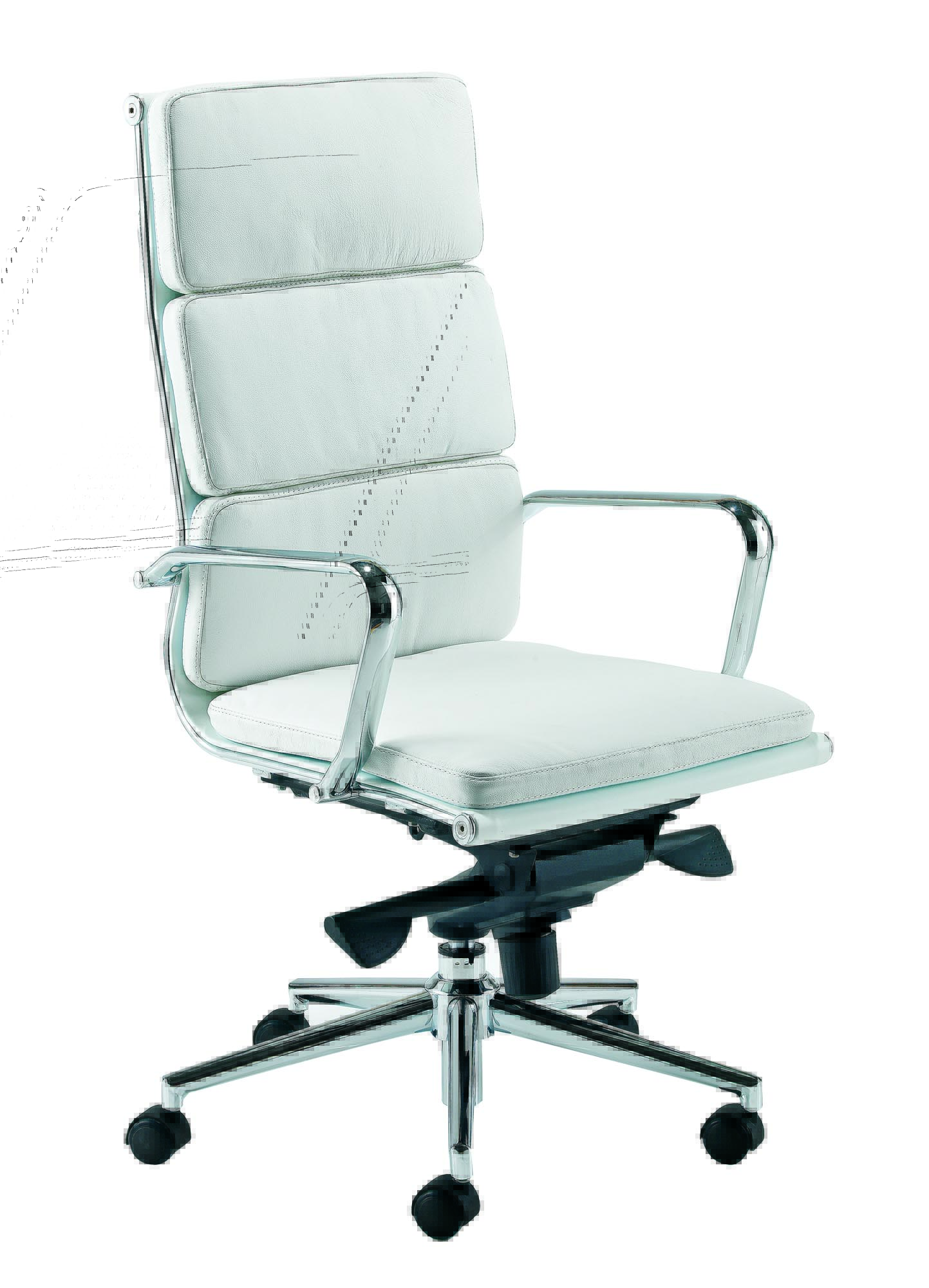 Aria Executive Black Leather Office Chair with Soft Pads, by Margolis. Available in 2 Fabrics: Black Leather / Vinyl, White Leather / Vinyl. High Back Armchair with Chrome Armrests and Base. Soft Padded Seat And Back. Soft Leather Facings. Knee Tilt Mechanism With Multi-Position Lock And Anti-Shock Brake. Tension Control.