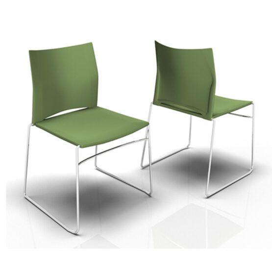 Feely Conference Stacking Chair. Polypropylene Stacking Chair by Margolis. Tubular Steel 11mm Frame in a Chrome Finish. Integrated linking pieces. Available in five different colour finishes: Taupe, Green, Red, Dark Blue and Black. Sold as a set of two chairs in the same colour. Stackable up to 10 units high. Fully upholstered versions of this chair are also available as well as a transport dolly.