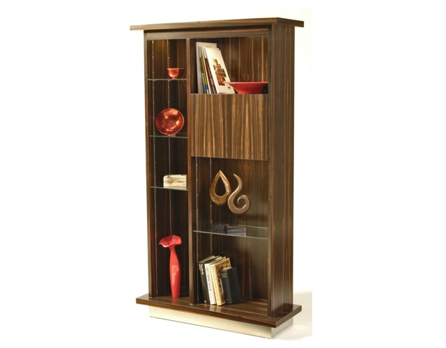 Contemporary Kudos bookcase featuring glass shelving, aluminum plinth and small push to open cupboard, featured image shows bookcase veneered in Macassar Ebony.