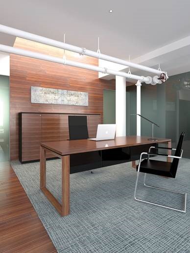 The Margolis Pure solid timber ‘loop’ leg Rectangular executive desk, measuring 1800 x 900 with medium height modesty panel. In a choice of over 20 real wood veneer options and RAL colours.